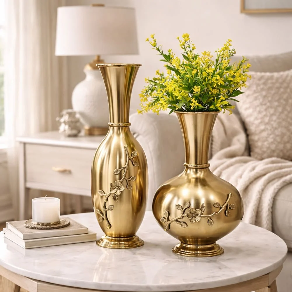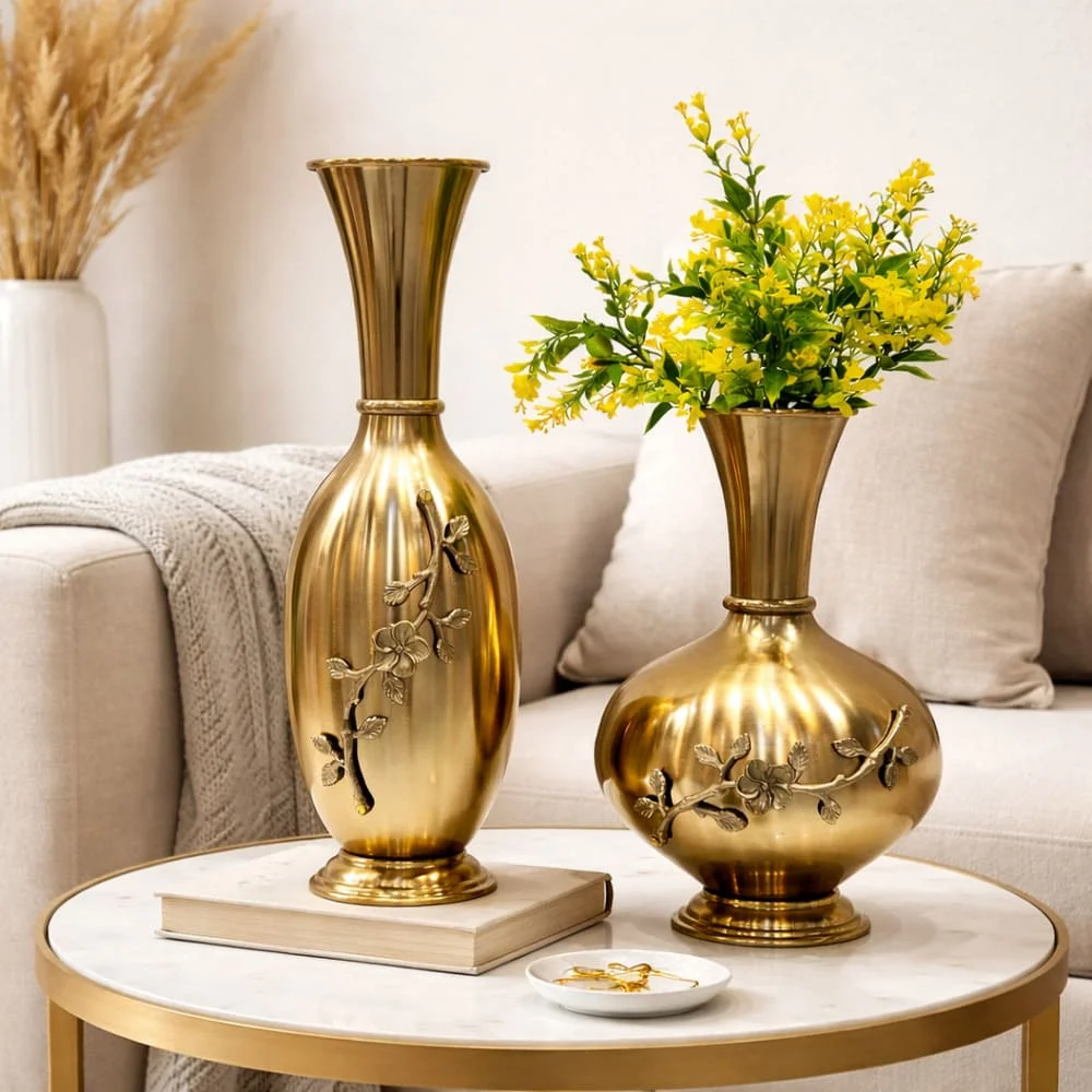 Each vase is made from durable metal and finished in an antique gold tone that reflects light softly, creating a warm and inviting presence. The subtle floral detailing on the body adds texture and visual interest without overpowering the overall design, making these vases easy to style in both traditional and modern interiors.