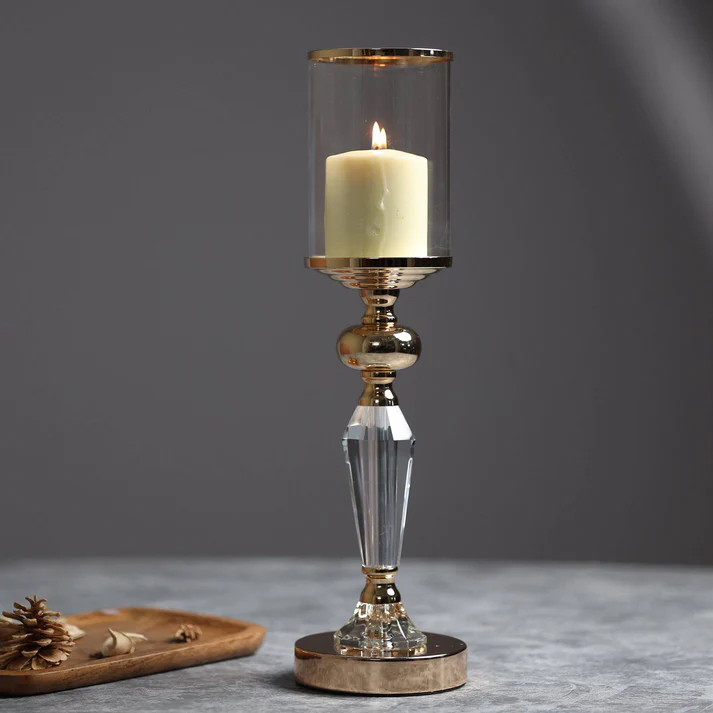 Each candle holder features a slender silhouette with a crystal accent at the center, adding brilliance and light reflection. The rose gold tone enhances the richness of the design, making these candle holders perfect for both modern and classic interiors. The glass cylinder protects the candle flame while allowing the light to shine beautifully through.