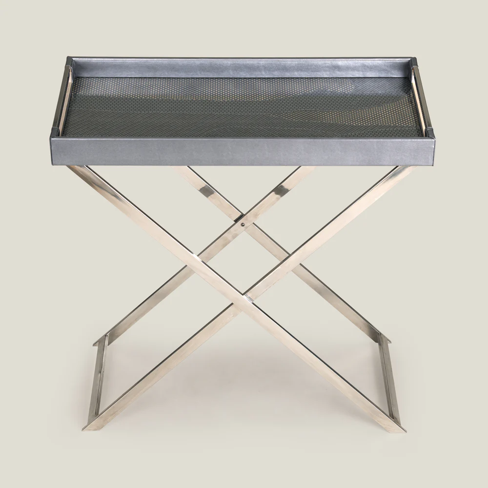 Bring refined style and modern artistry into your space with the Lumina Platinum & Silver Faux Leather Butler Tray Table. Designed to make a quiet yet confident statement, this piece blends contemporary design with thoughtful detailing. The tabletop features platinum-toned faux leather enhanced with laser-cut patterns arranged in an abstract layout, creating a surface that feels rich, layered, and visually engaging.