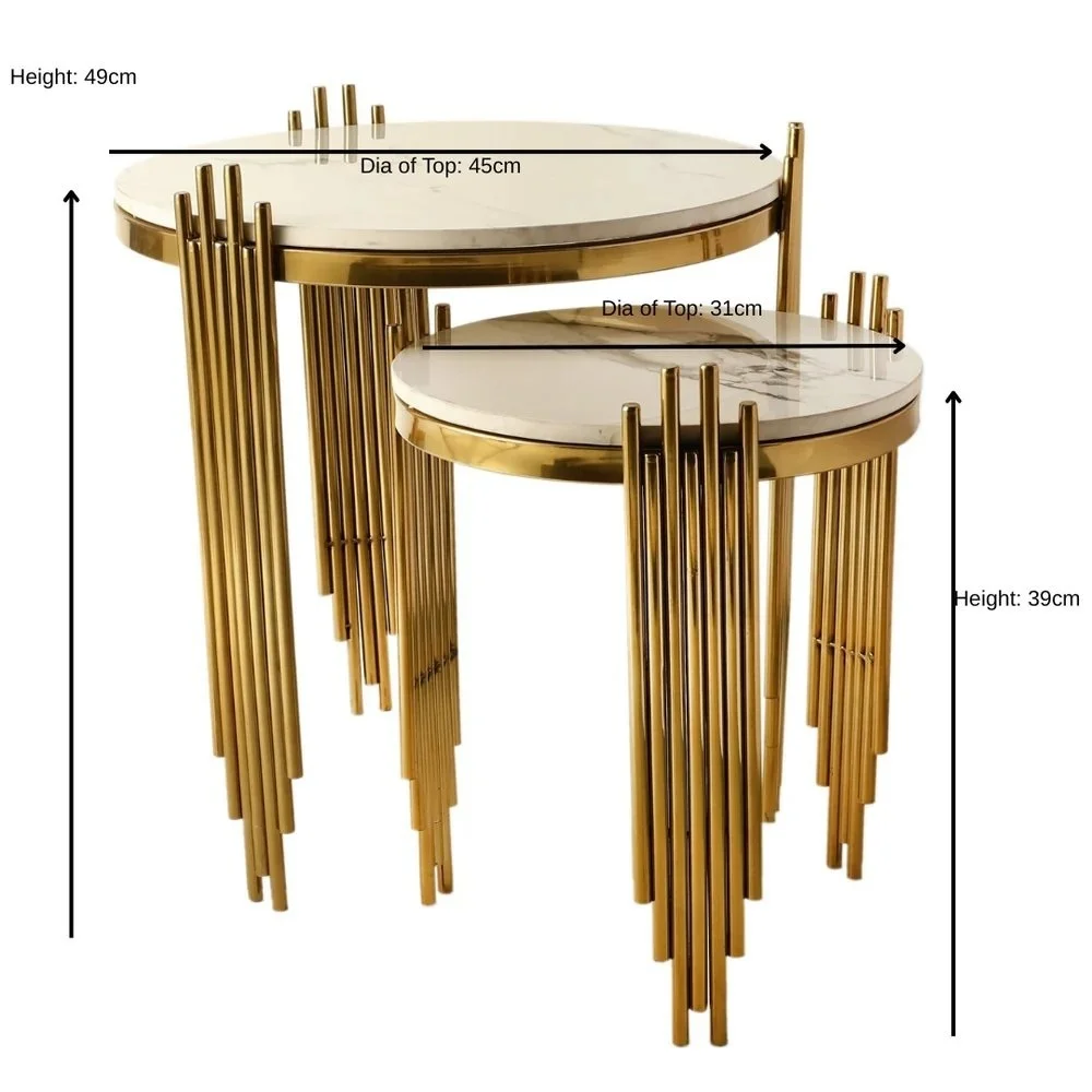 Add a touch of refined style to your home with the Sylvia Nesting Tables. Designed to stand out without feeling overwhelming, this elegant set combines smooth white marble tops with a sculptural gold-finished base. The result is a balanced look that feels modern, luxurious, and timeless.